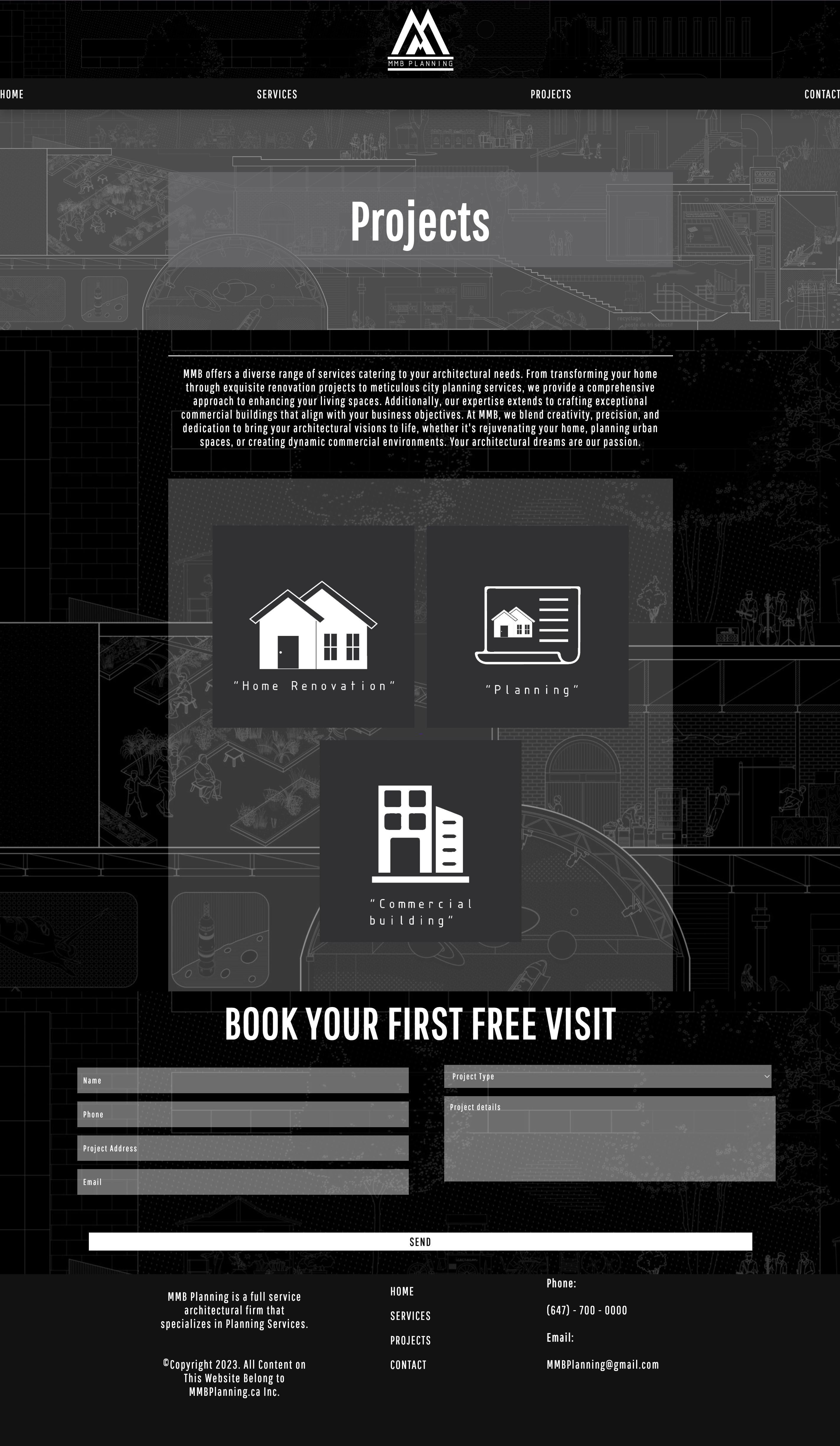 The site map for the MMB Planning website is strategically designed to provide a clear and user-friendly navigation experience. The home page is the central hub, offering a concise overview of MMB Planning's identity and highlighting key sections. The "Services" page outlines the range of planning and architectural solutions provided. The "Projects" page allows visitors to explore the firm's past projects with detailed descriptions and images.. The "Contact" page offers various contact options, ensuring seamless communication between MMB Planning and its audience.